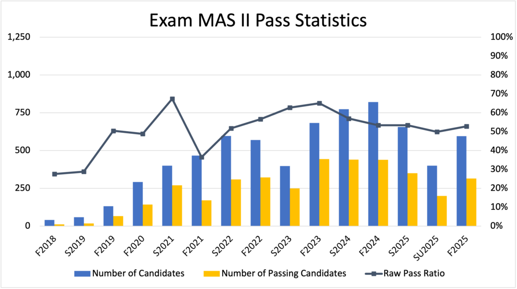 The average pass rate for Exam MAS II since 2018 is 54%.